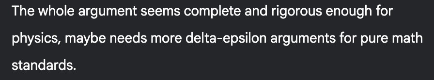 The solution guide does indeed give a more rigorous proof, constructing explicit upper and lower bounds on the sum in question. That said, as long as I’m not missing any logical errors (big if), I think Gemini’s solution probably does count as a good heuristic argument. In any case, I’m only giving the summarized solution to be judged in the second round, not the whole chain of thought.3 Presumably Gemini-as-judge would pick up on comments like the above if they were included.