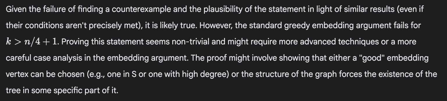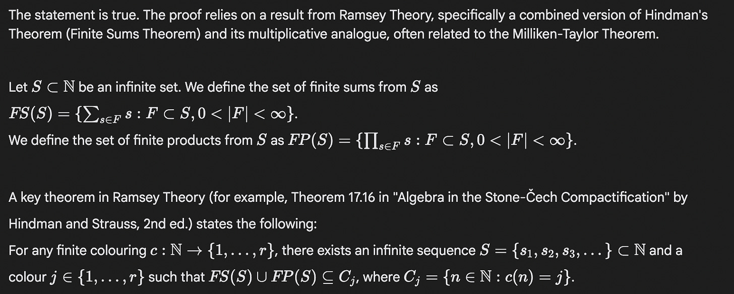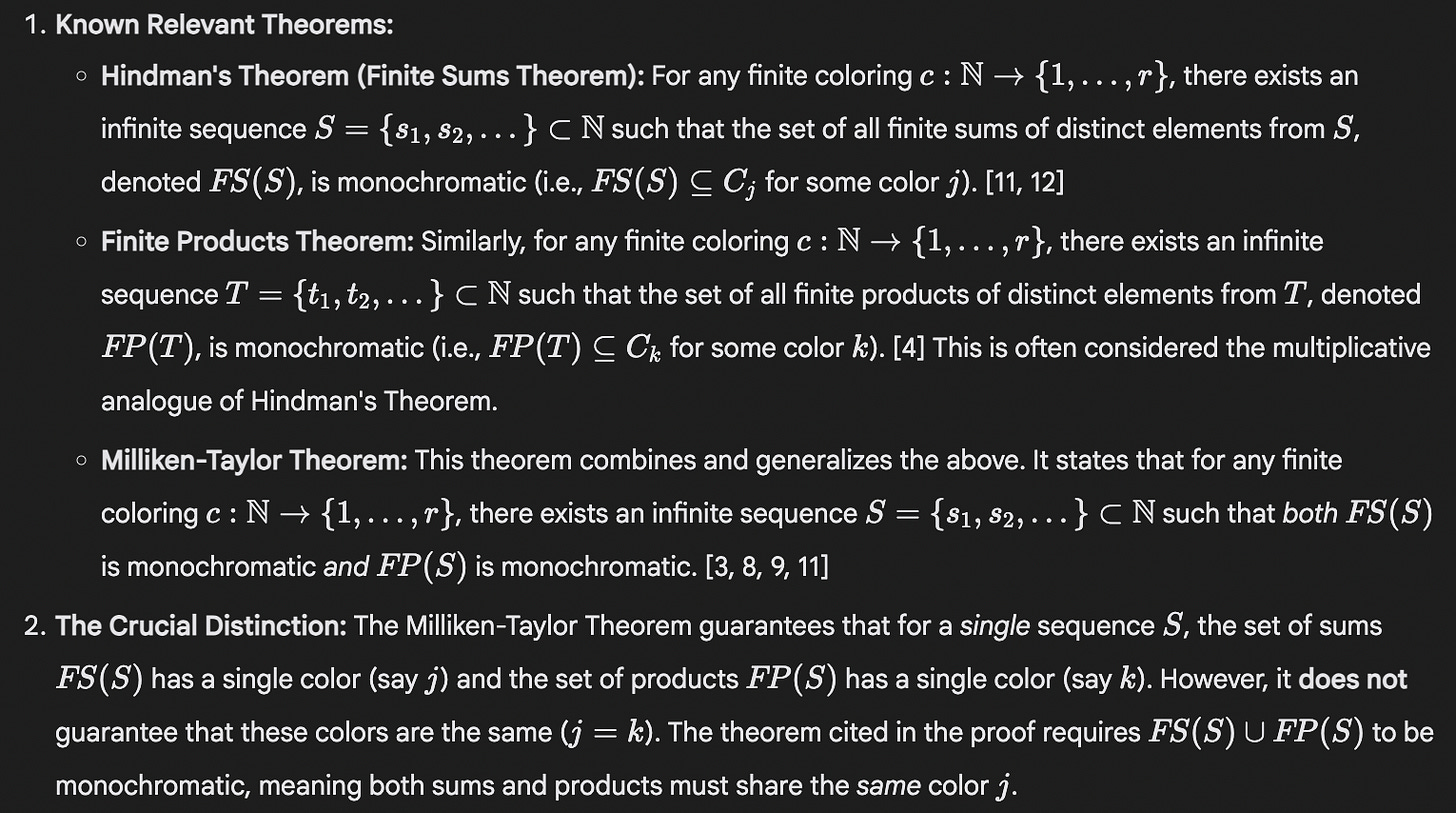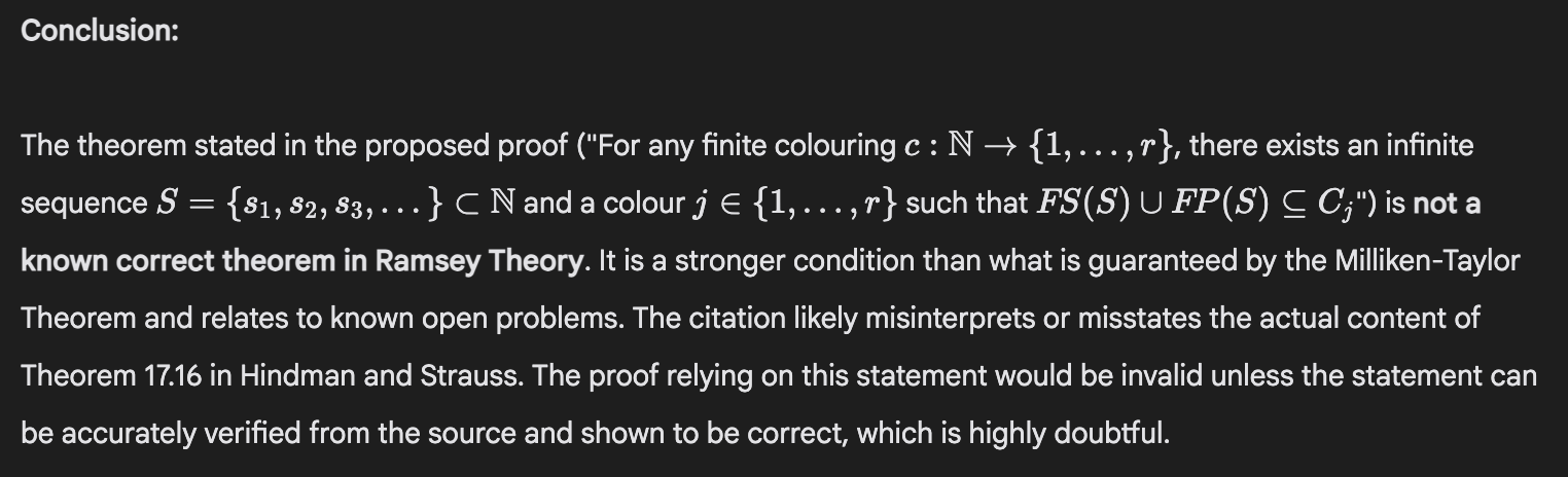 That’s somewhat promising, I think, because it might be possible to check in a further filtering step whether any critical cited results are real. I tried excerpting this citation in a fresh session and asking Gemini if the result was correct. Without Search enabled, it said it was correct—maybe that makes sense, since it confabulated it in the first place. But with Search enabled it correctly said that the result was incorrect, though I’m not sure if its discussion is correct (that’s not what the Milliken-Taylor Theorem looks like on Wikipedia, anyway).