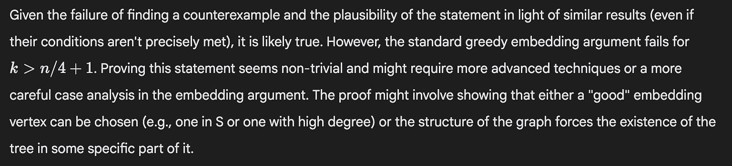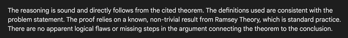 But the second-round filter only corrected one of those false positives: 5/6 times it stated that the solution was largely complete. This is consistent with what I’d described before about how it seems to like its own proofs. So I do think Gemini might have something new here.