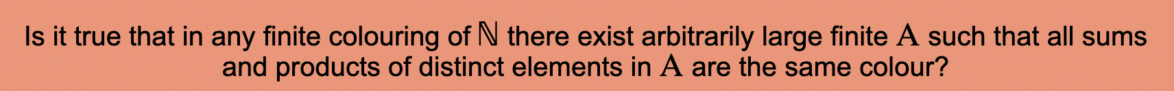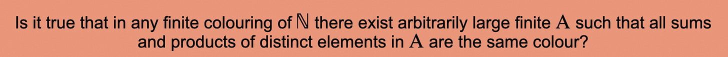 This problem seems very well-covered in the literature. A positive resolution was conjectured first by Hindman, who showed that if A is infinite then the statement is false. It’s still an active area of research. In 2023, it was shown by Alweiss that the conjecture is true if N (positive integers) is replaced by Q (rational numbers).