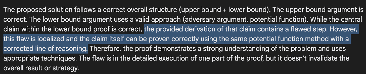 To its credit, it doesn’t always make that mistake: in the second-round judgement it sometimes does state that the answer is right but the proof is wrong. For instance, here it is evaluating the solution to 2024 IMO P6: