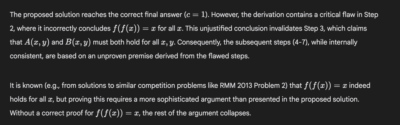 The right final answer is actually c=2, not c=1. So it’s wrong about that in both the first and second round. However, in the second round, it is right about the logical flaw.2 So, it’s good that it’s judging the proof correctly and independently of the answer. Still, given the result on the Turbo the snail problem, I wonder if these sorts of judgements are less robust.