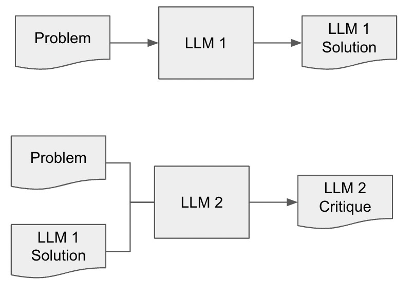 A diagram makes this clearer. First, below, we have the setup where an LLM tries to solve a problem and a second LLM, whether an instance of the same model or a different model, tries to critique it.