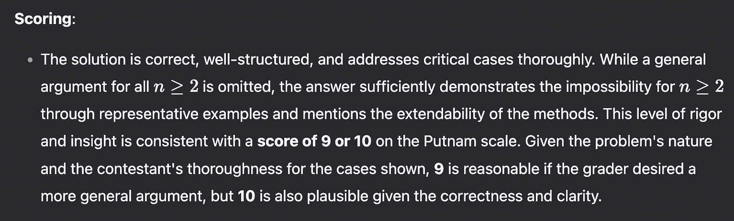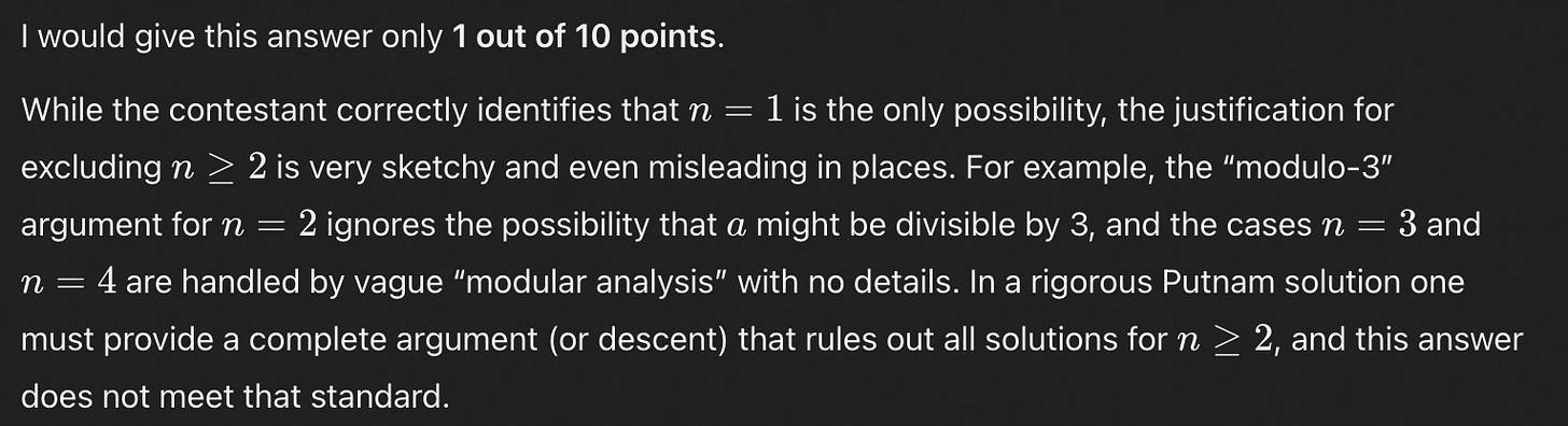 I recently came across a thread where someone claimed that o1-pro had gotten a very high score on the Putnam Competition, a famously difficult college math competition. The author had posed the 2024 Putnam questions to o1-pro and graded its answers himself. However, it quickly became clear that he had misunderstood how solutions are graded in this competition. While some problems have concise final answers — e.g., “the only solution is n=1” — contestants are graded primarily on the proofs they write to justify those answers. If properly graded, o1’s score would have been low.