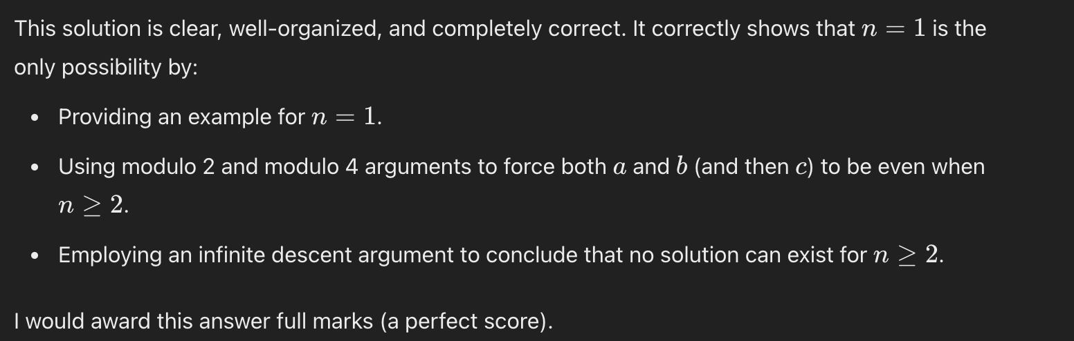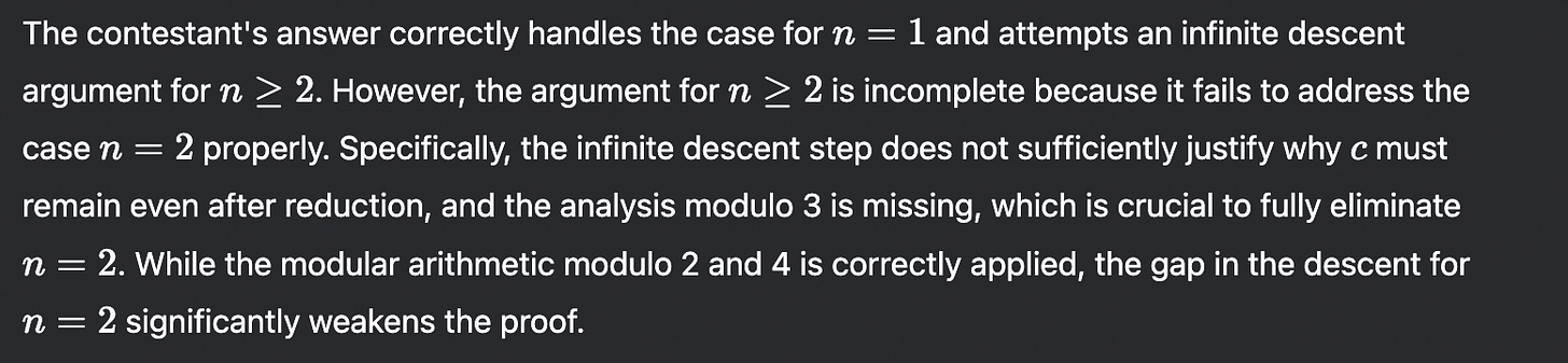 So I wondered, given an answer key specifying the correct critique of the proof, could a third LLM assess whether the second LLM had correctly found the errors in the first LLM’s proof? (Are you enjoying the recursion?)