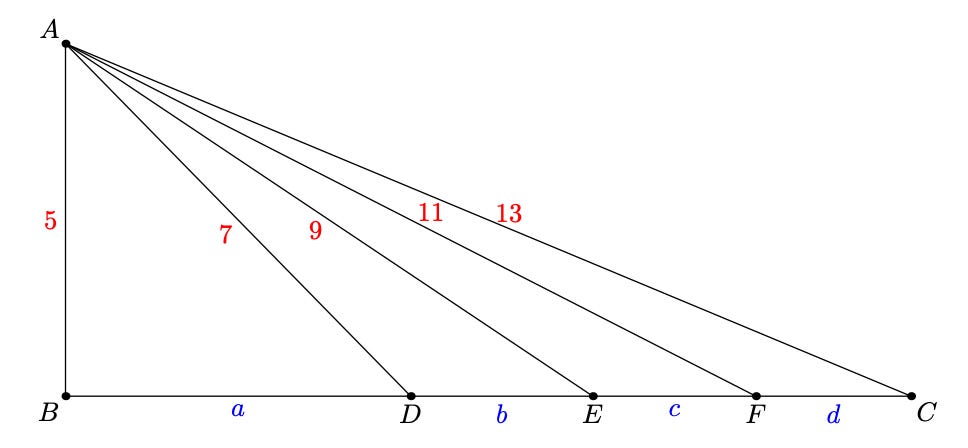 I imagine this is a bit of a polarizing problem: some might find it compelling, others exasperating. Presumably Chen is among the former. The insight here is that these equations are a geometry problem in disguise. The first three equations are what you get if you apply Stewart’s theorem to this diagram, and the last equation says that BC=12.