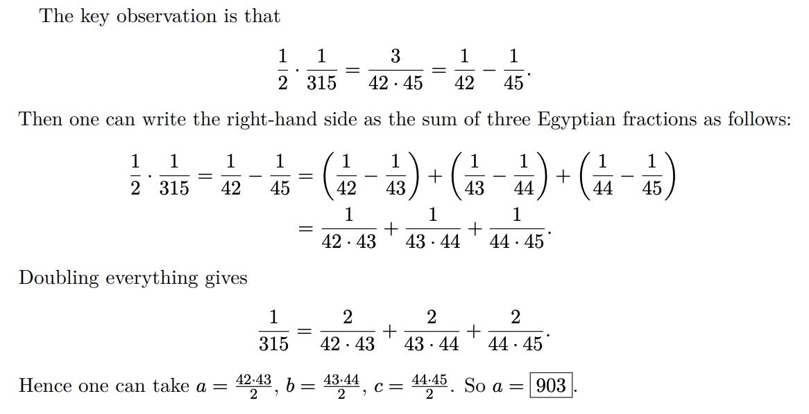 As usual: that’s very relatable! It’s a totally valid way to guess the answer, and it would even get full credit on the AIME. But it’s a bit risky, because it doesn’t prove that one of the variables must be 100. It might be missing something. Since this approach would be time-consuming for a human on the clock (you have to work out lots of examples), and might yield the wrong answer, I wouldn’t expect most contestants to see it through.
