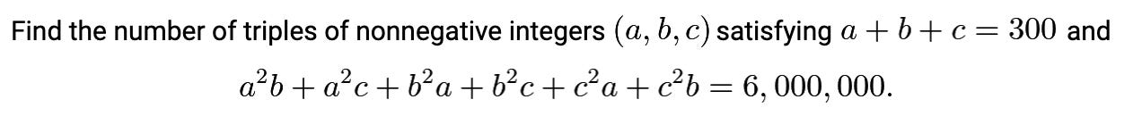 That’s the key: it means that at least one of a, b, and c must be 100. It’s then easy to check that there are no other constraints: if one of the numbers is 100, then the other two can be any pair of non-negative numbers that add up to 200. For each of a,b,c being 100, there are 201 possible pairs for the other two. This triple-counts (100, 100, 100), so the answer is 201*3 - 2 = 601.