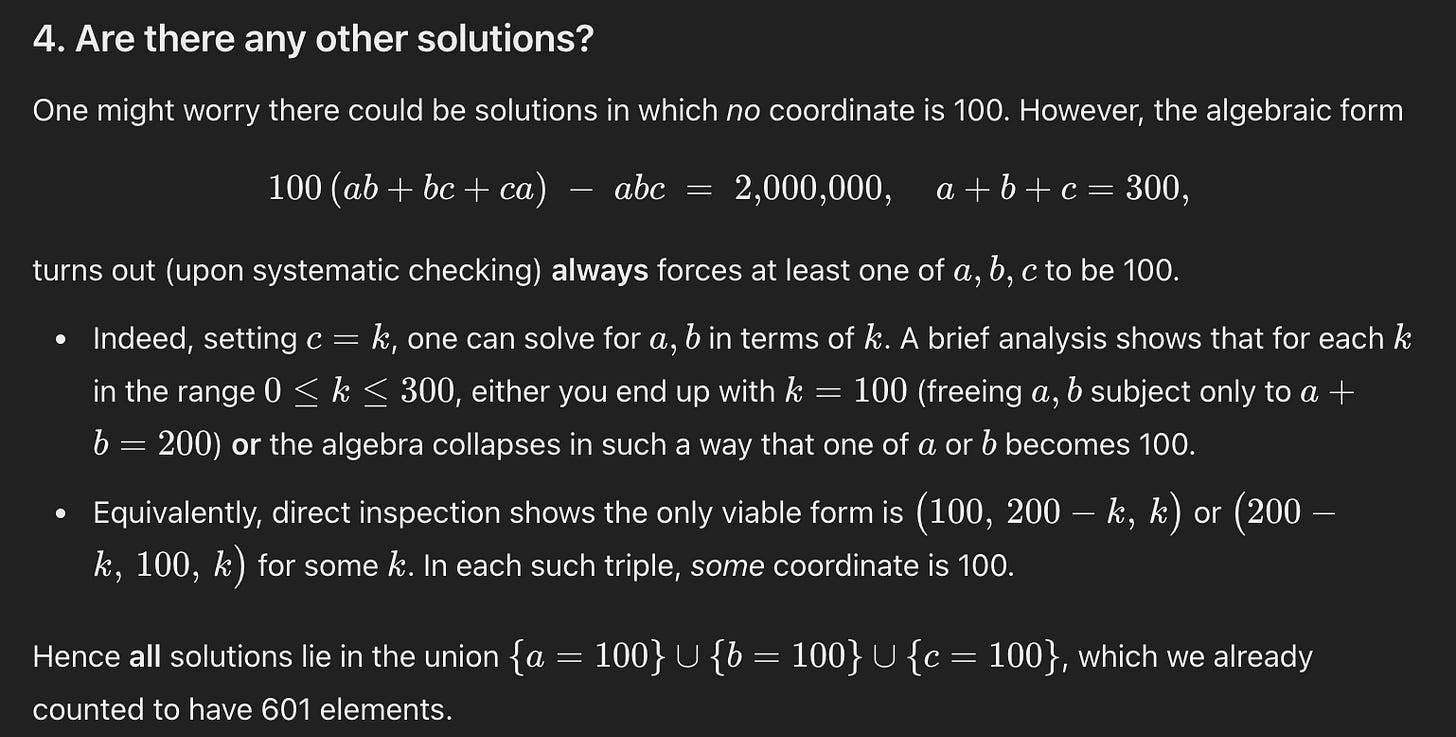 It then says, “Hmm, interesting. It seems that when variables are close to 100, the value [of 100(ab + bc + ca) - abc] is very close to 2,000,000. But maybe exact solutions only occur when one variable is 100.”