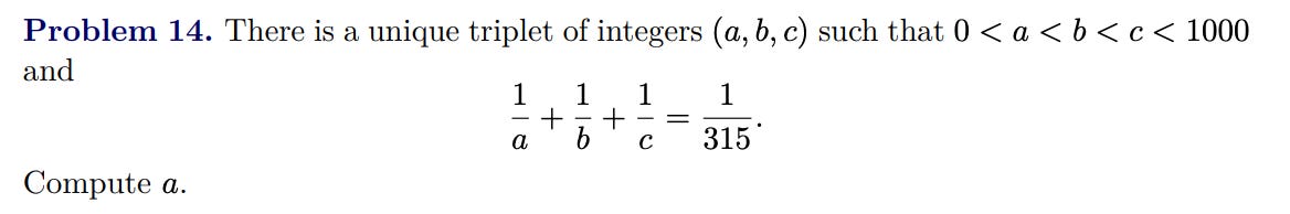 Do these insight-driven problems suggest a deeper limitation to AI systems? I would be surprised if these specific problems did. It seems to me that the relevant insights can be expressed fairly concisely: “try expressing 1/315 using partial fractions” or “consider Stewart’s theorem” are pretty good hints. I think that gives some hope that a similar AI system, just working 10x as fast and considering 10x as many ideas, would be able to hit on the key insights. Then again, giving those hints to the AI systems today doesn’t help them find the key insights, so maybe I’m overestimating their value.