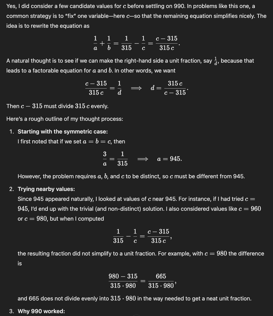 What it means about “leading to a factorable equation for a and b” is that, if 1/a+1/b=1/d, then (a-d)(b-d)=d^2 and, after finding the prime factors of d, this is manageable to solve. Essentially: it hoped the problem would work out nicely, and spent some time testing just in case. That’s not guaranteed: just because the reciprocals of a, b, and c sum to an integer doesn’t mean some two of them do as well. But it just so happens to work for c in this case.1 In fact, o3-mini-high appears to be sensitive to the wording: the problem was originally worded to ask for a, but if you instead ask for c it gets the right answer much more reliably.