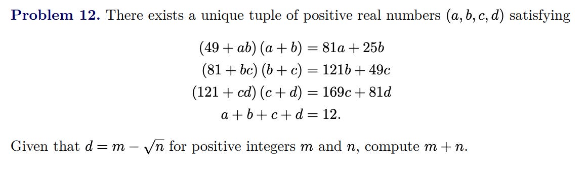The solution revolves around an insight which takes a bit of a eureka moment to find. That’s what makes this problem harder than usual for the AIME, and I also imagine that’s why it’s one of Chen’s favorites: it’s very satisfying if you do find it.